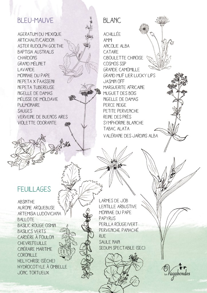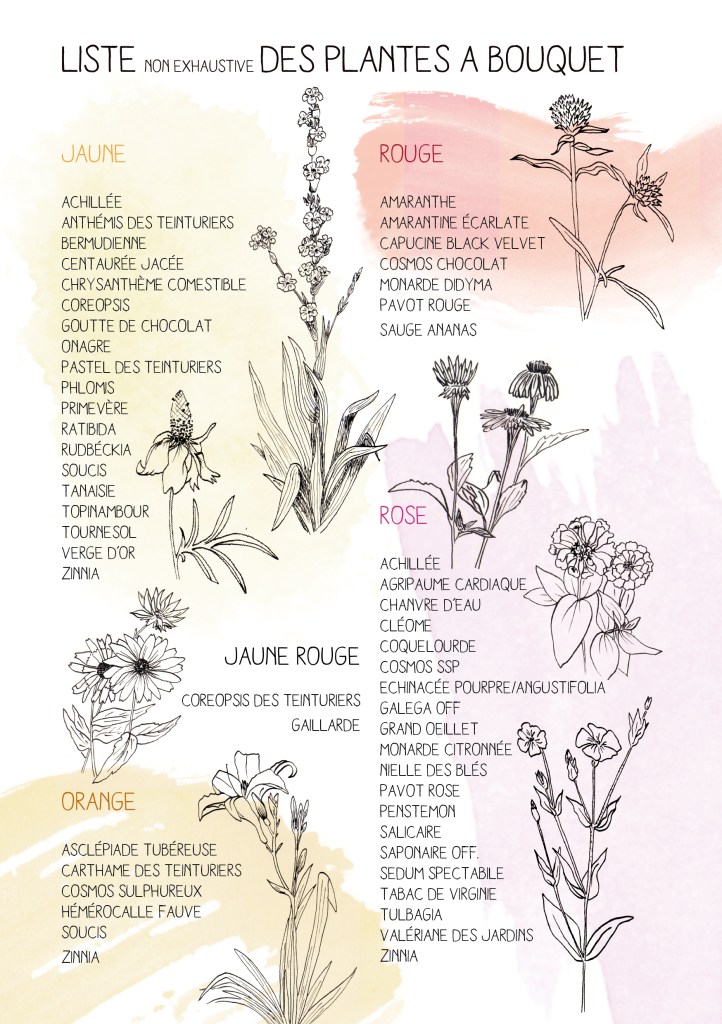 Les plantes sont classées par couleur de leur floraison. Une liste est également dédiée aux feuillages et fleurs sèches qui peuvent accompagner les bouquets, à cueillir ou contempler au jardin, car outre leur beauté, beaucoup d’entre elles sont mellifères.